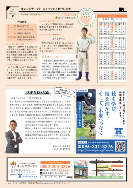 お庭づくり、外構工事の広報紙「ニュースレターvol.10」スタッフ紹介、トップメッセージ、採用情報