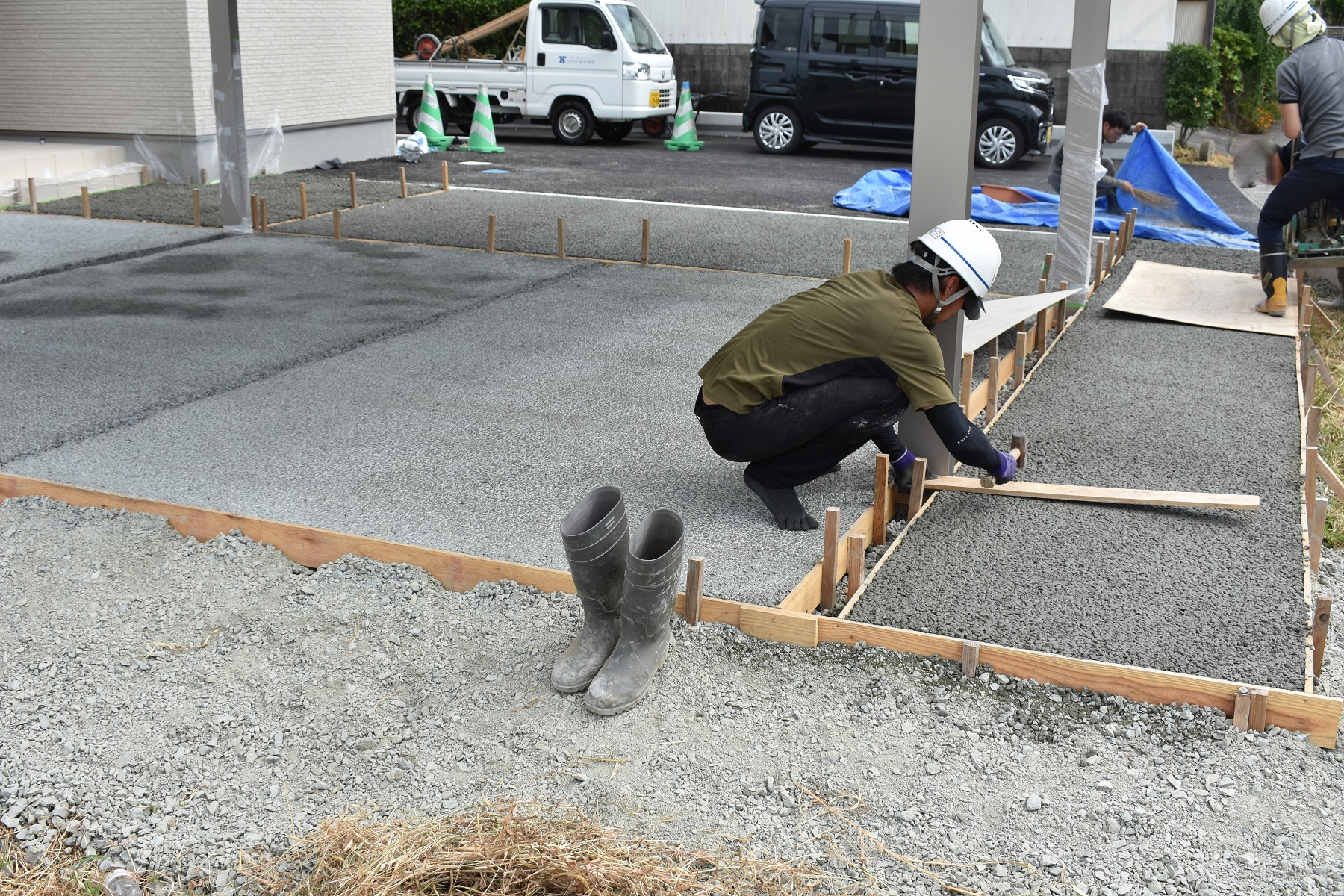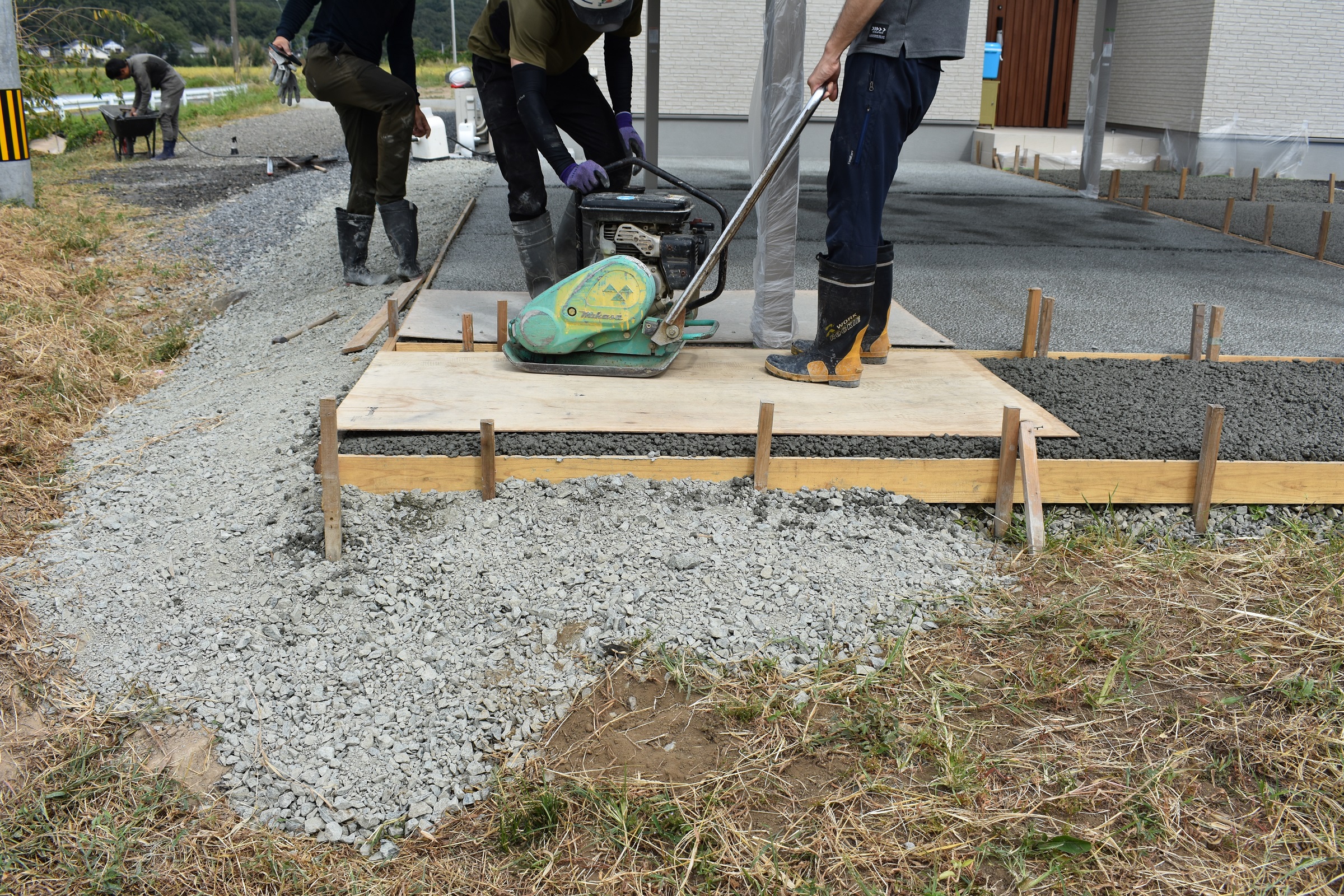 現場へ行くとちょうどコンパネを挟み、プレートでの転圧作業が行われていました。